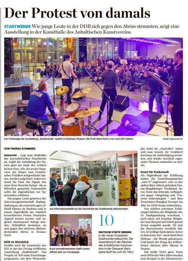 Der Anhaltische Kunstverein Dessau e.V., die Stadt Dessau-Roßlau sowie das Forschungskollektiv Stadtwende zeigen vom 17.02.2023 bis zum 26.03.2023 die Wanderausstellung „Stadtwende“, welche sich dem Verfall der DDR-Innenstädte, der Baupolitik und dem zivilen Engagement für die Rettung historischer Stadtquartiere Ende der 1980er Jahre widmet.