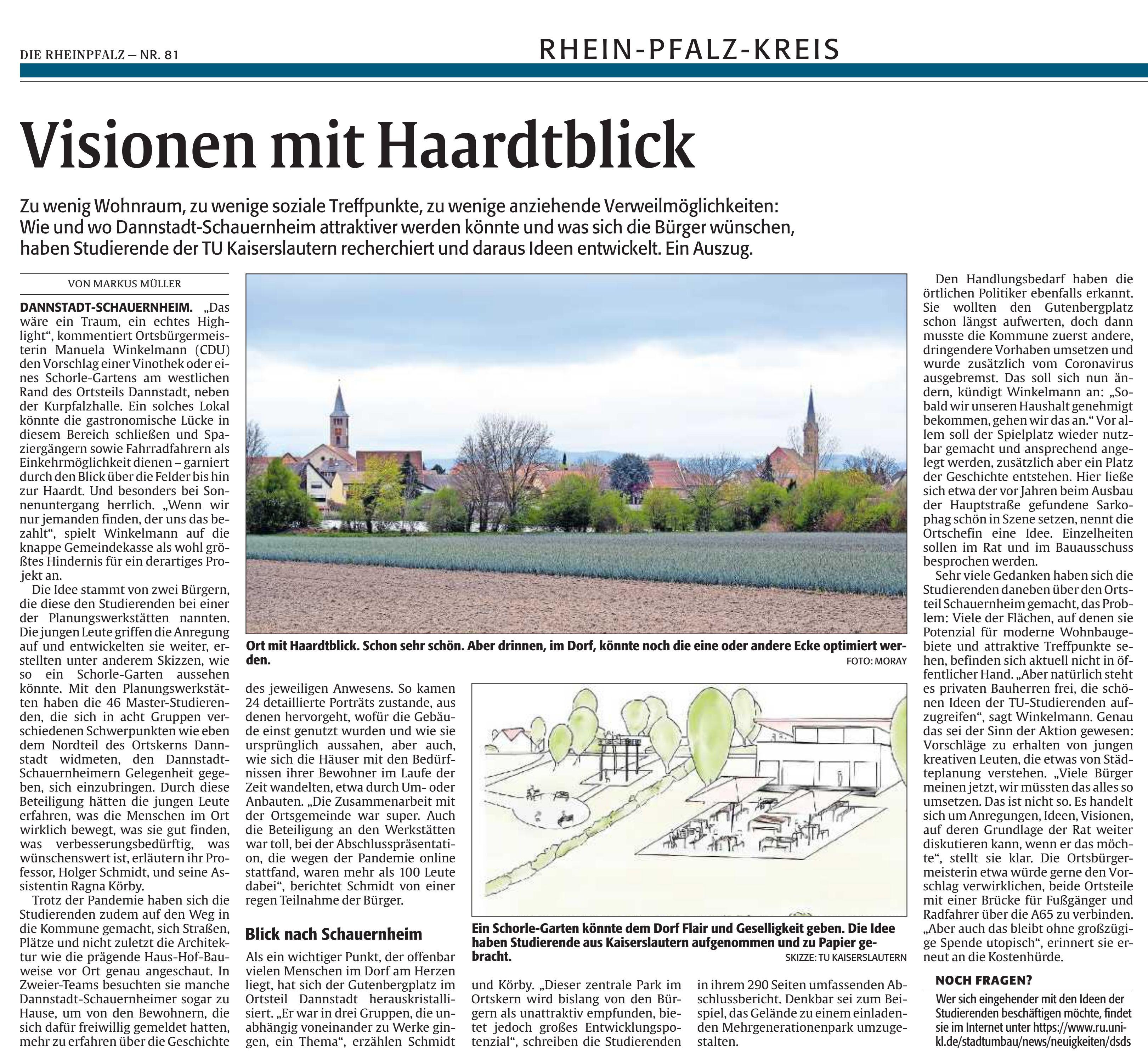 Im Rahmen des Kurses „Stadtumbau und Stadterneuerung“ beschäftigten sich 40 Masterstudierende im Wintersemester 2021/22 mit Dannstadt-Schauernheim. Die Ergebnisse dieses Kooperationsprojektes zwischen Ortsgemeinde und Universität wurden am 22.02.2022 in einer digitalen Veranstaltung vorgestellt. An dieser nahmen, neben den Universitätsangehörigen, zahlreiche Bürgerinnen und Bürger aus Dannstadt-Schauernheim und weitere Interessierte teil.